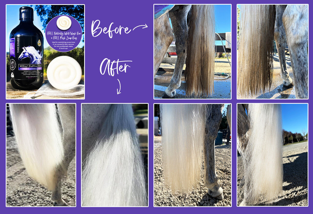 Say goodbye to yellowing, grass stains, and brassy tones. Bee Kind’s plant-based Whitening & Brightening Shampoo is infused with purple toning pigments to help neutralise unwanted warmth, lift stains, and reveal a cleaner, brighter, more even-looking coat—perfect for white, grey, palomino, and other light-coloured horses.