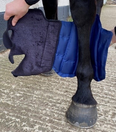 Step 4 - Wrapping the WETTED leg: Line up the bottom of the wrap so it covers the fetlock joint adequately. Make sure the raised top section of the gel wrap is aligned with the back of the leg, in the middle of the knee or hock. Wrap around the leg and secure the straps to the Velcro. Tighten after a minute to ensure the wrap is secure and in contact with the leg. Remove after 10-15mins, dry off. Push the gel back up the wrap and check the heat seals at the bottom are still intact. If they are beginning to come apart you must be more proactive about pushing the gel back up the wrap. Then return to the freezer.