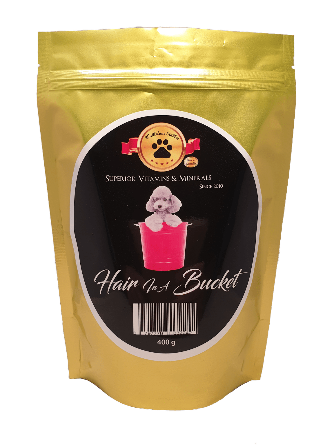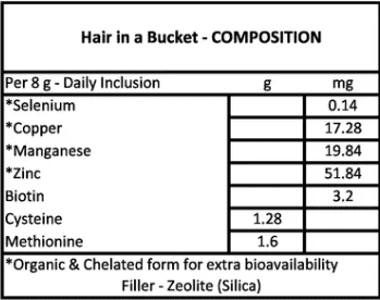 Hair in a Bucket for Dogs is a targeted coat support supplement formulated to help promote healthy hair and wool growth in dogs. With a carefully selected combination of key nutrients including methionine, biotin, organic zinc, organic copper, organic manganese, organic selenium and cysteine, it provides nutritional support for coat condition, growth and overall skin and hair health.