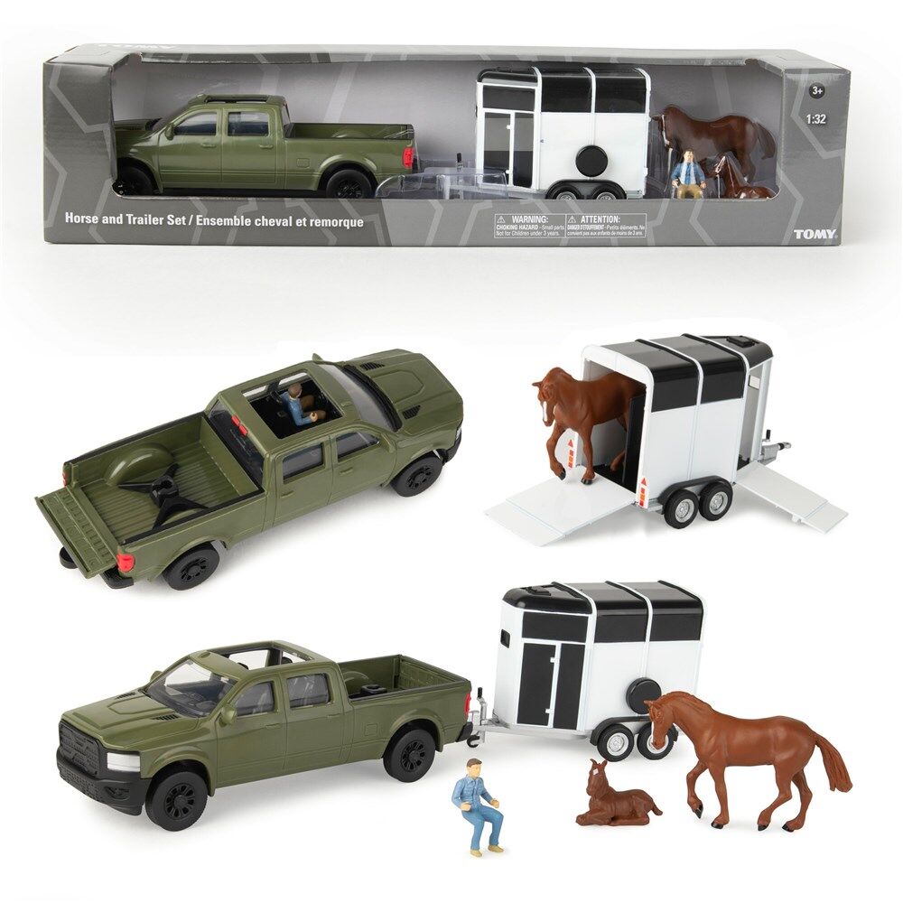 This 5-piece set features a truck with an open roof for the driver, a horse trailer with a working back gate, a seated figure, a horse, and a colt. Suitable for ages 3+.