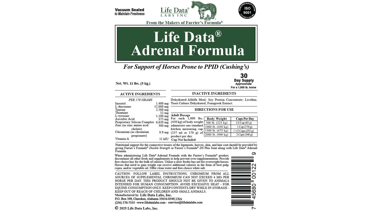 Life Data® Adrenal Formula provides active ingredients that can benefit horses with PPID, or Cushing’s. The active ingredients may help improve glucose metabolism, regulate adrenal and thyroid hormones, and improve metabolism. It also provides antioxidants and active ingredients to rebuild healthy connective tissue. Life Data® Adrenal Formula was developed utilizing blood test results derived from the Life Data® Research Program.