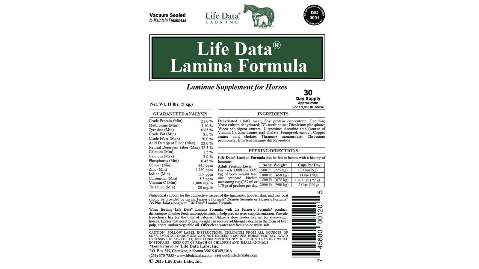 Life Data® Lamina Formula can be fed to horses with a history of laminitis. Nutritional support to strengthen the connective tissue of the hooves should be provided by giving Farrier's Formula® original or Farrier's Formula® Double Strength along with Life Data® Lamina Formula.