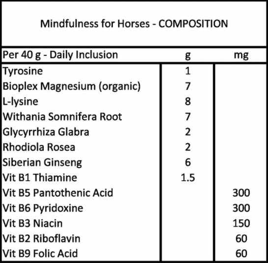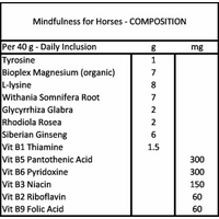 Mindfulness for Horses is a calming feed supplement formulated to support relaxation, focus and emotional balance in horses. It combines key nutrients including Bioplex magnesium, B vitamins and the amino acid tyrosine with a carefully selected blend of plant extracts traditionally used to support horses during times of stress, tension and environmental pressure.