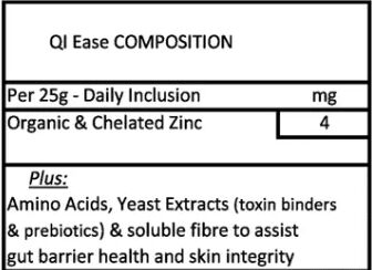 QI Ease for Dogs contains organic zinc, prebiotics and toxin binders to support skin, immune and digestive health.