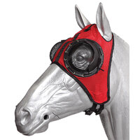 This model (sometimes referred to as a "pacifier") has a mesh eye, which apart from protecting the eyes from debris, has a remarkable calming effect on the horse. The mesh eye is stitched onto the hood, and includes a lace-on half cup, which may be removed or repositioned as required.
